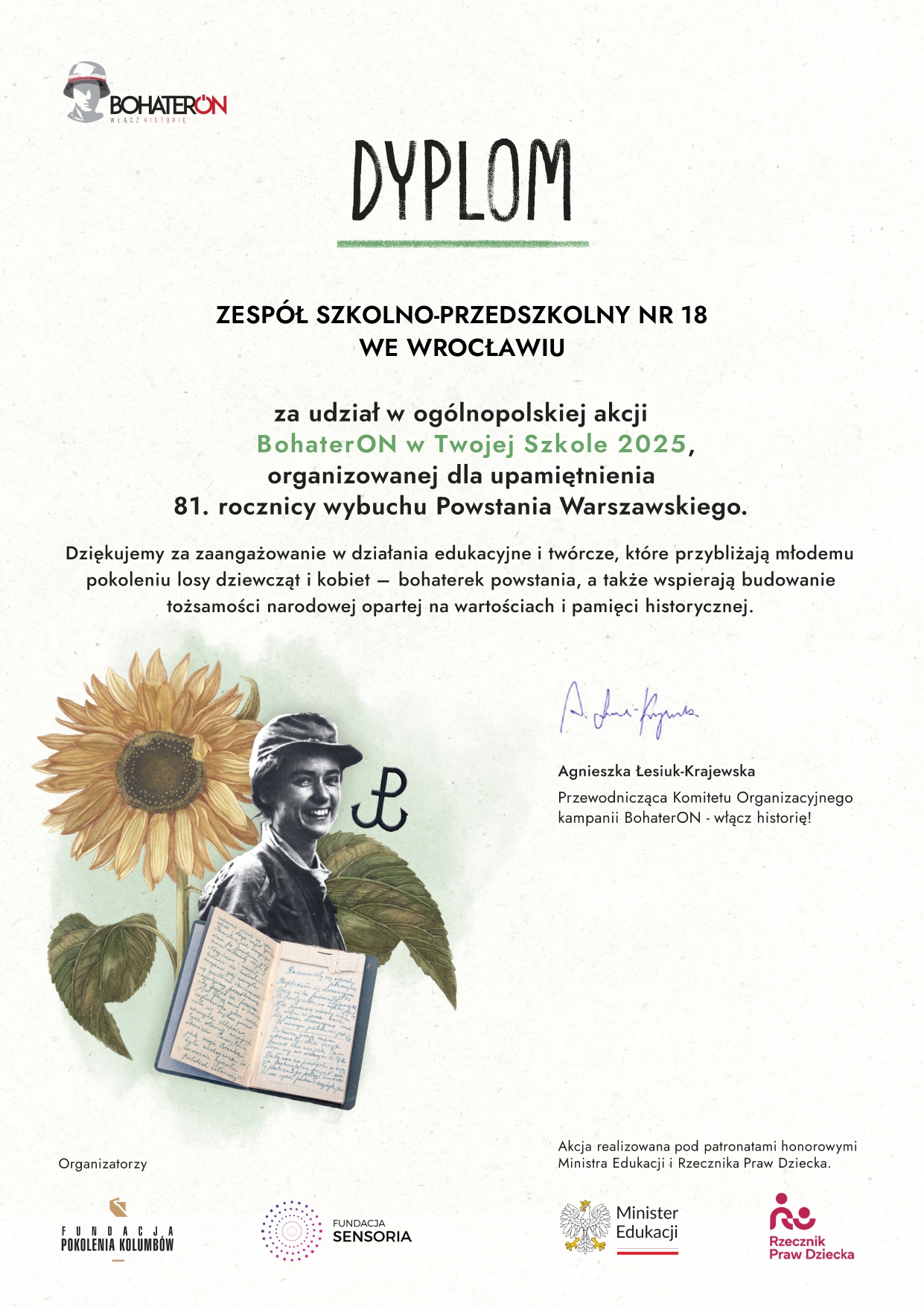 W ramach ogólnopolskiej kampanii o tematyce historycznej BohaterON we wrześniu i październiku 2025 roku w naszej szkole zostały przeprowadzone różnorodne działania upamiętniające 81.rocznicę wybuchu Powstania Warszawskiego. Na parterze oraz II piętrze przygotowano gazetki tematyczne,a w bibliotece wystawę książek. Odbyły się także lekcje przedmiotowe i zajęcia czytelnicze związane z Powstaniem Warszawskim. W tym roku szczególną uwagę zwróciliśmy na udział kobiet w powstaniu. Pod koniec grudnia otrzymaliśmy dyplom od organizatorów.