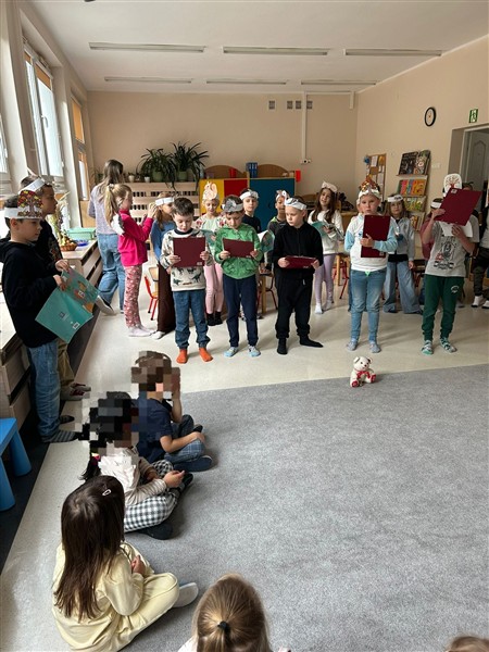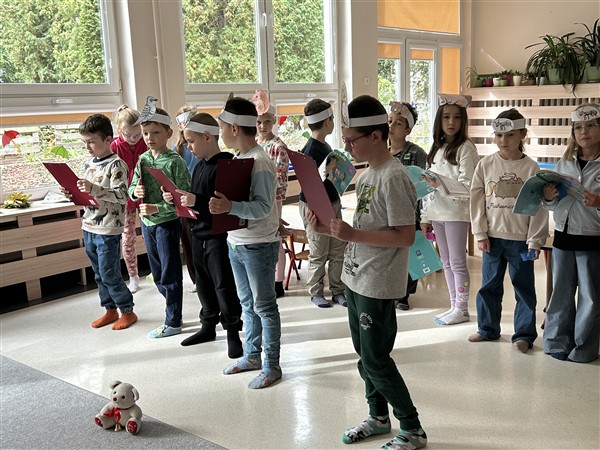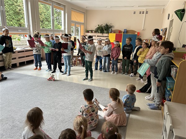 Z okazji Dnia Głośnego Czytania uczniowie klasy 2a odwiedzili przedszkolaki z grupy 1 w naszym przedszkolu. Zaprezentowali przedszkolakom opowiadanie pt. „Stary, zielony miś”, które przeczytali z pełnym zaangażowaniem, dbając o piękną interpretację tekstu. Następnie zaprezentowali inscenizację „Bal jesieni”, wprowadzając wszystkich w jesienny nastrój. Trzylatki z energią i zaangażowaniem zaprezentowały się w piosence „Jeż”.