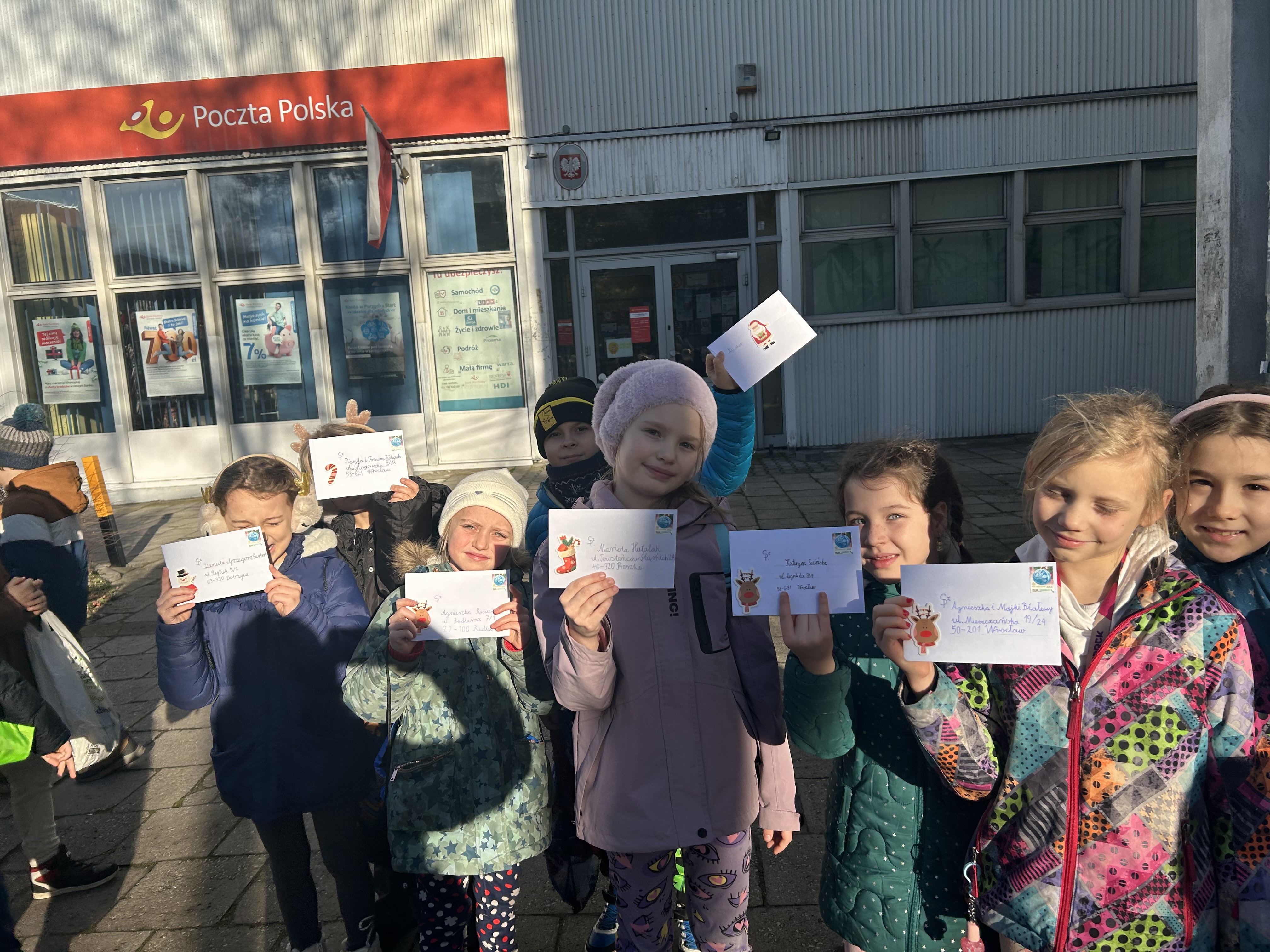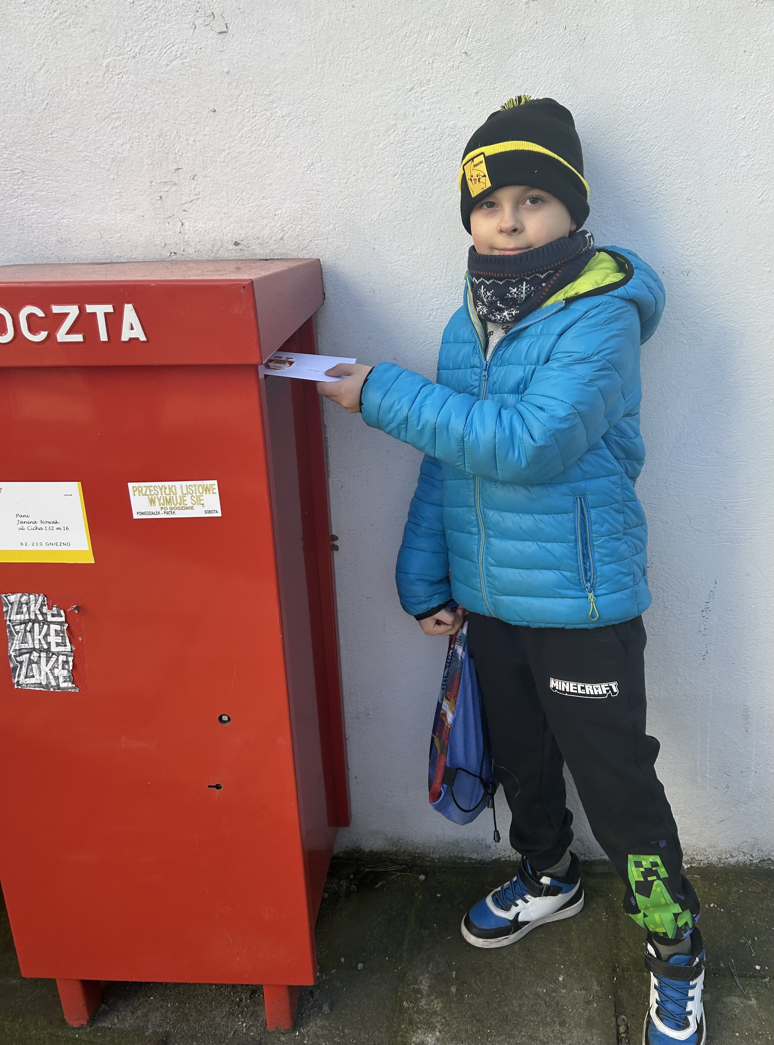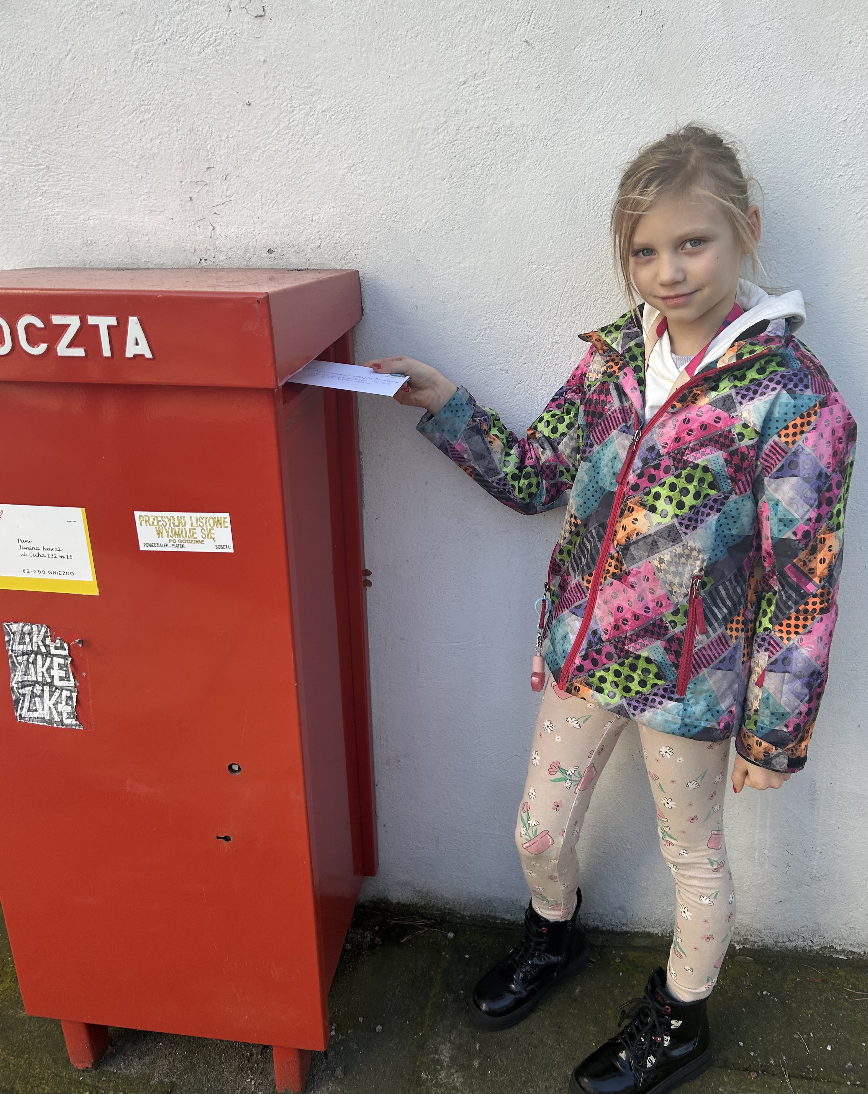 Każda kartka została własnoręcznie napisana, starannie zaadresowana, opatrzona znaczkiem i kodem pocztowym. Zwieńczeniem tej wyjątkowej lekcji była wizyta na poczcie, gdzie kartki wyruszyły w drogę do najbliższych. ❤️