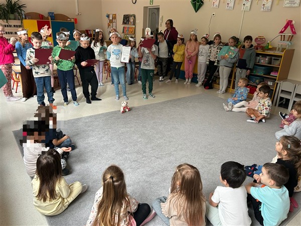 Z okazji Dnia Głośnego Czytania uczniowie klasy 2a odwiedzili przedszkolaki z grupy 1 w naszym przedszkolu. Zaprezentowali przedszkolakom opowiadanie pt. „Stary, zielony miś”, które przeczytali z pełnym zaangażowaniem, dbając o piękną interpretację tekstu. Następnie zaprezentowali inscenizację „Bal jesieni”, wprowadzając wszystkich w jesienny nastrój. Trzylatki z energią i zaangażowaniem zaprezentowały się w piosence „Jeż”.