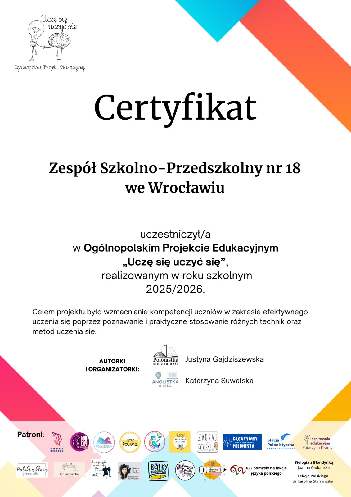 Uczennice i uczniowie naszej szkoły wzięli udział w Ogólnopolskim Projekcie Edukacyjnym „Uczę się uczyć się”. Dziękuję za zaangażowanie, otwartość na nowe metody pracy oraz chęć rozwijania kompetencji uczenia się. Zaproponowane przez organizatorów projektu działania i materiały okazały się inspirujące i przydatne w codziennej pracy dydaktycznej. Dziękuję pani Annie Dejewskiej za cenną współpracę. Agnieszka Sadownik