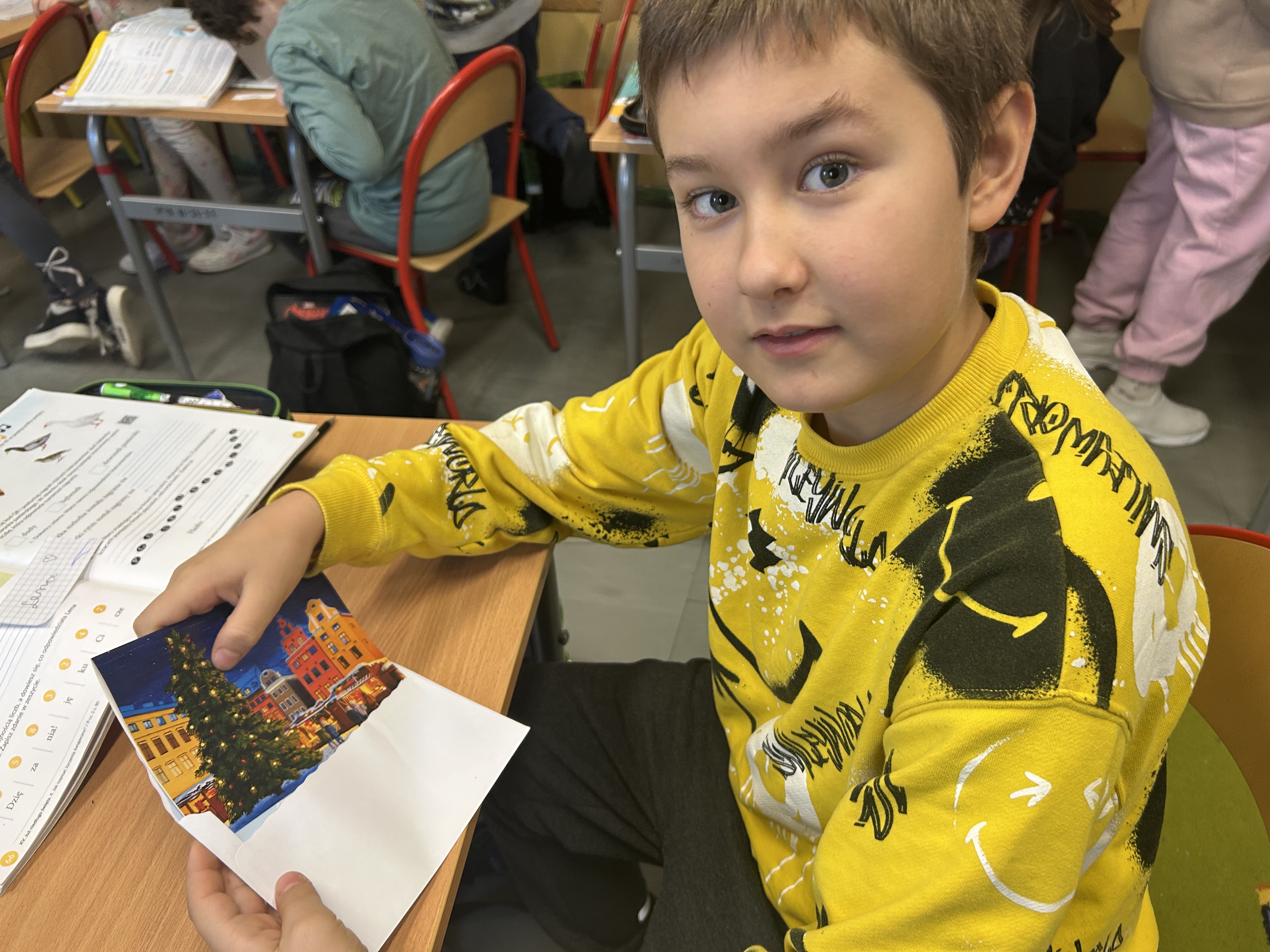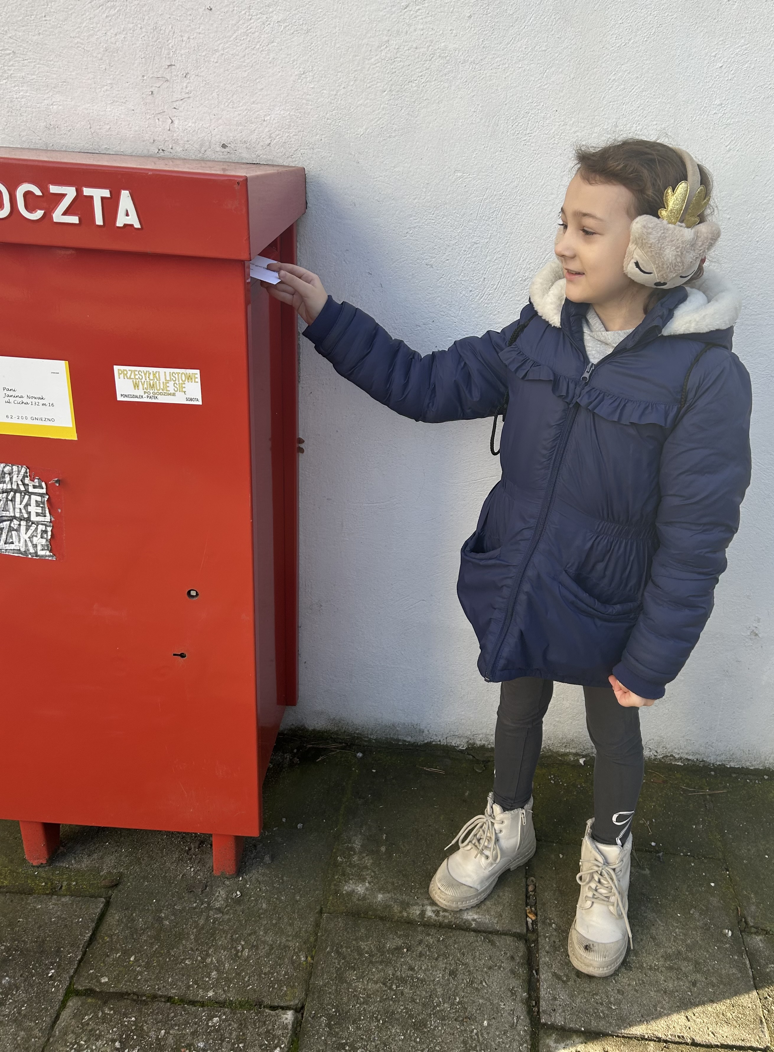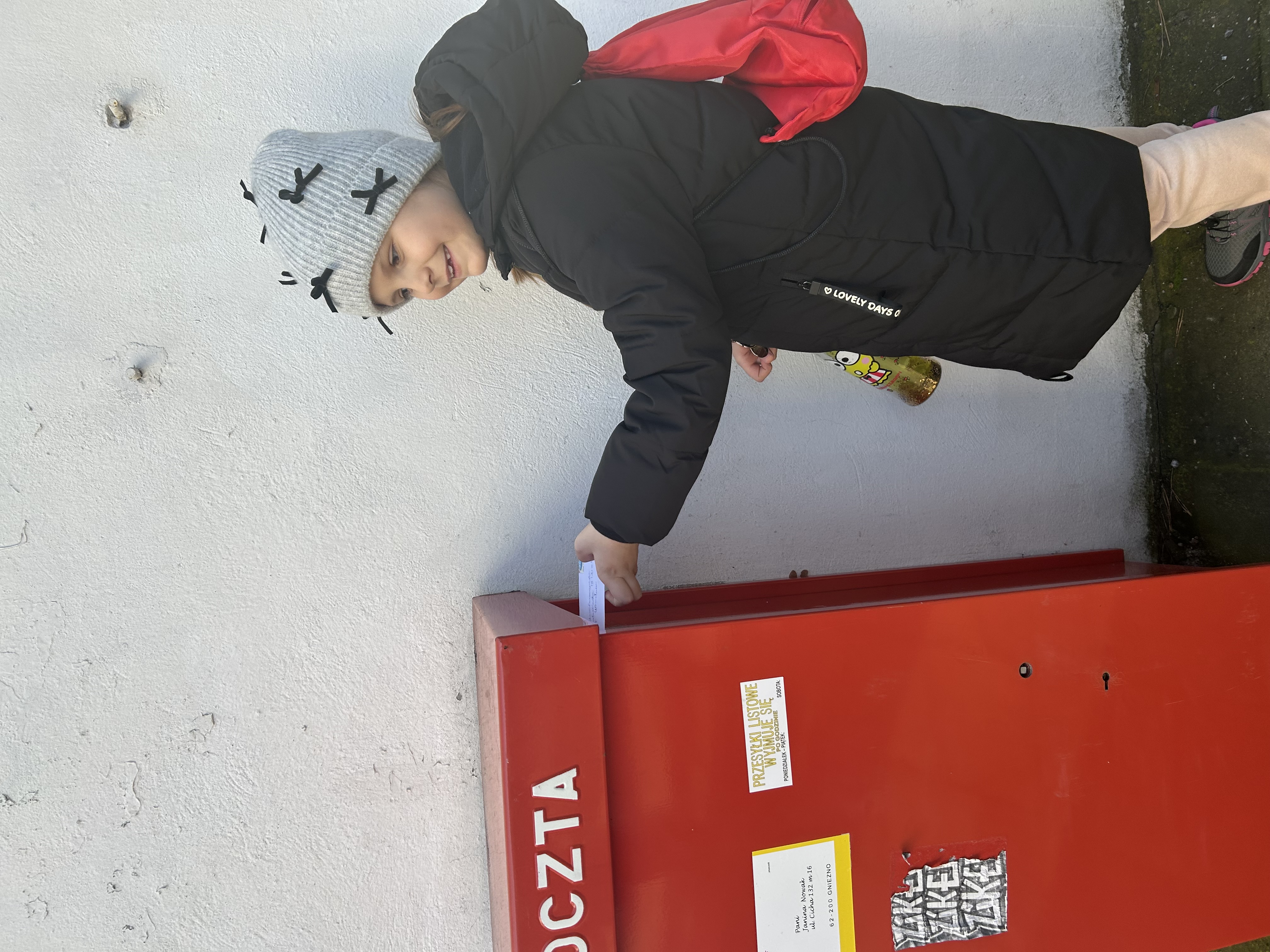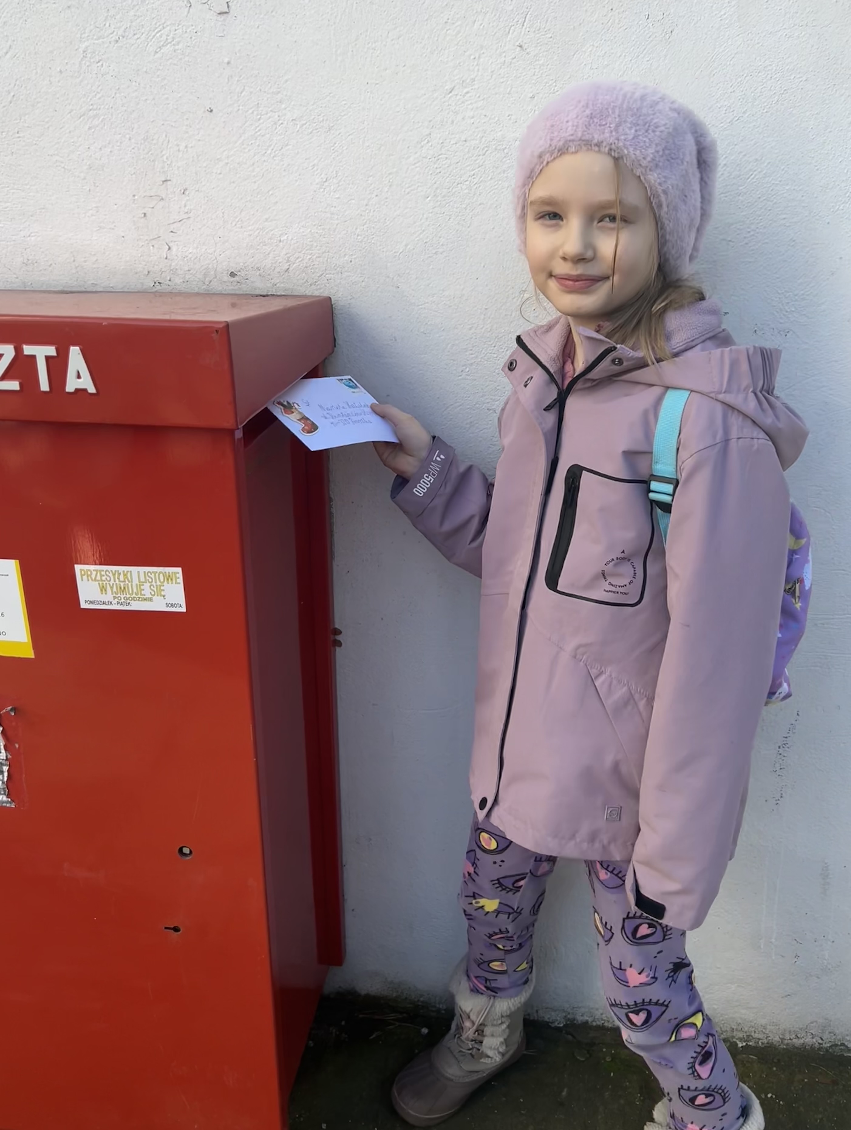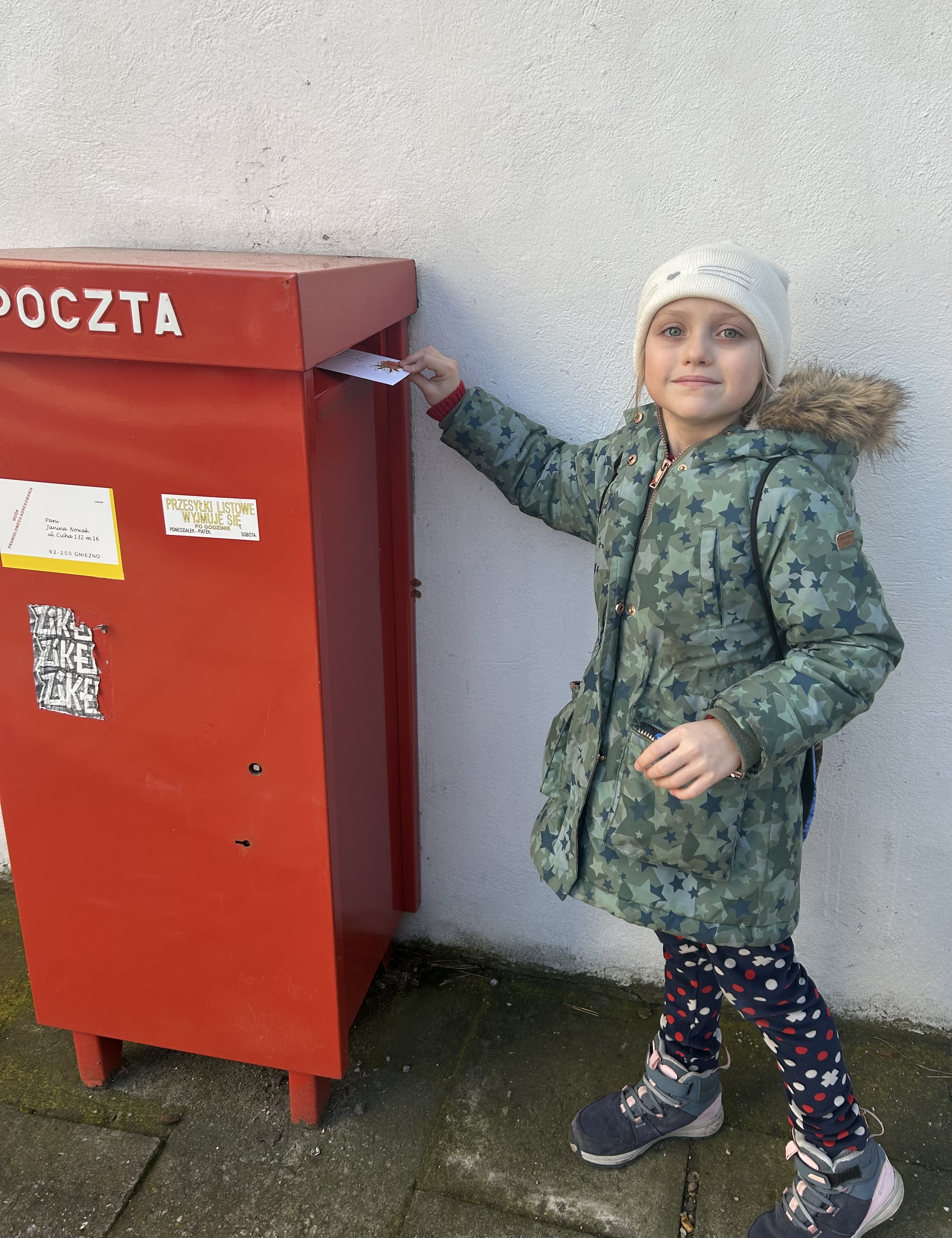 Każda kartka została własnoręcznie napisana, starannie zaadresowana, opatrzona znaczkiem i kodem pocztowym. Zwieńczeniem tej wyjątkowej lekcji była wizyta na poczcie, gdzie kartki wyruszyły w drogę do najbliższych. ❤️