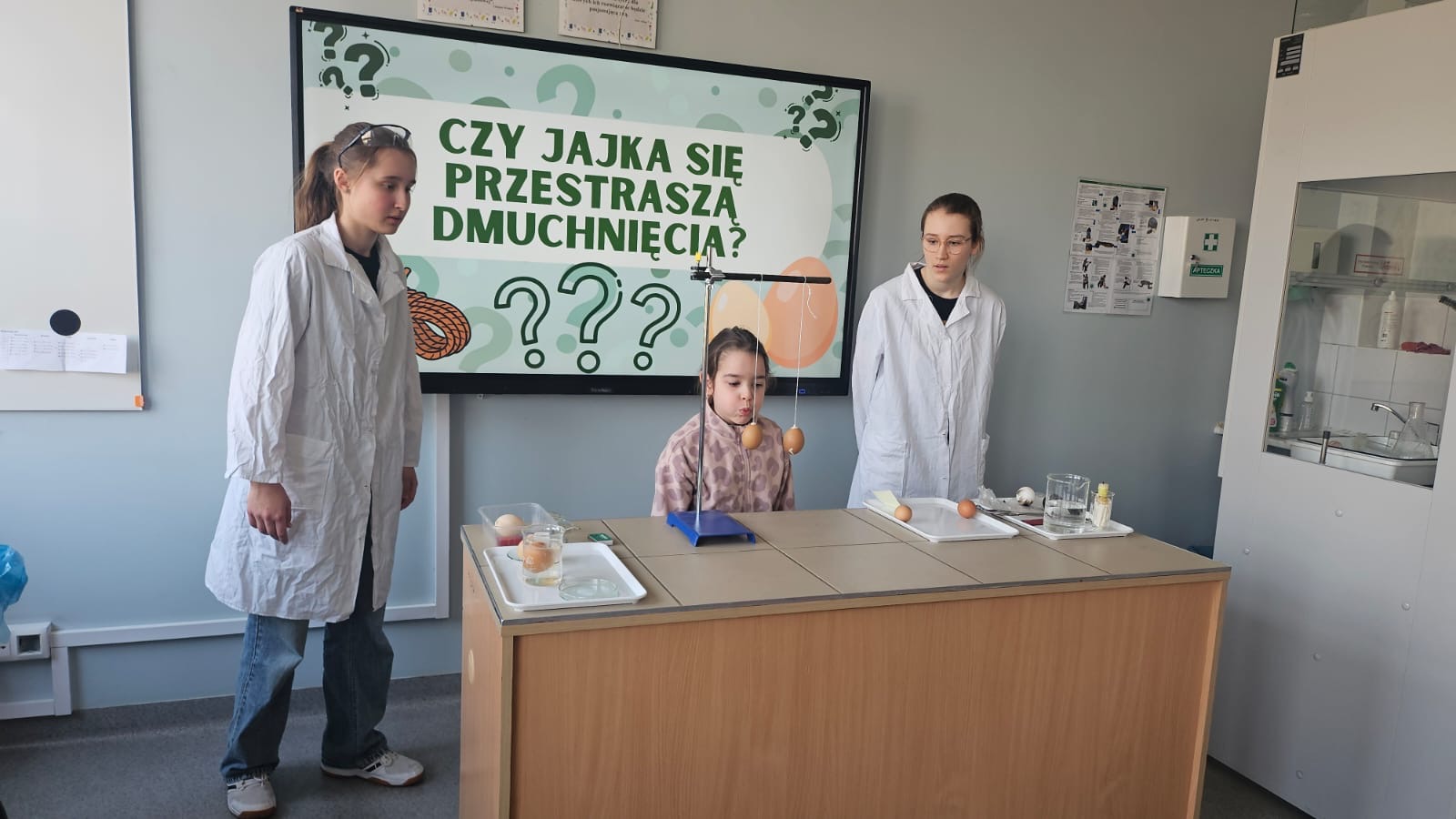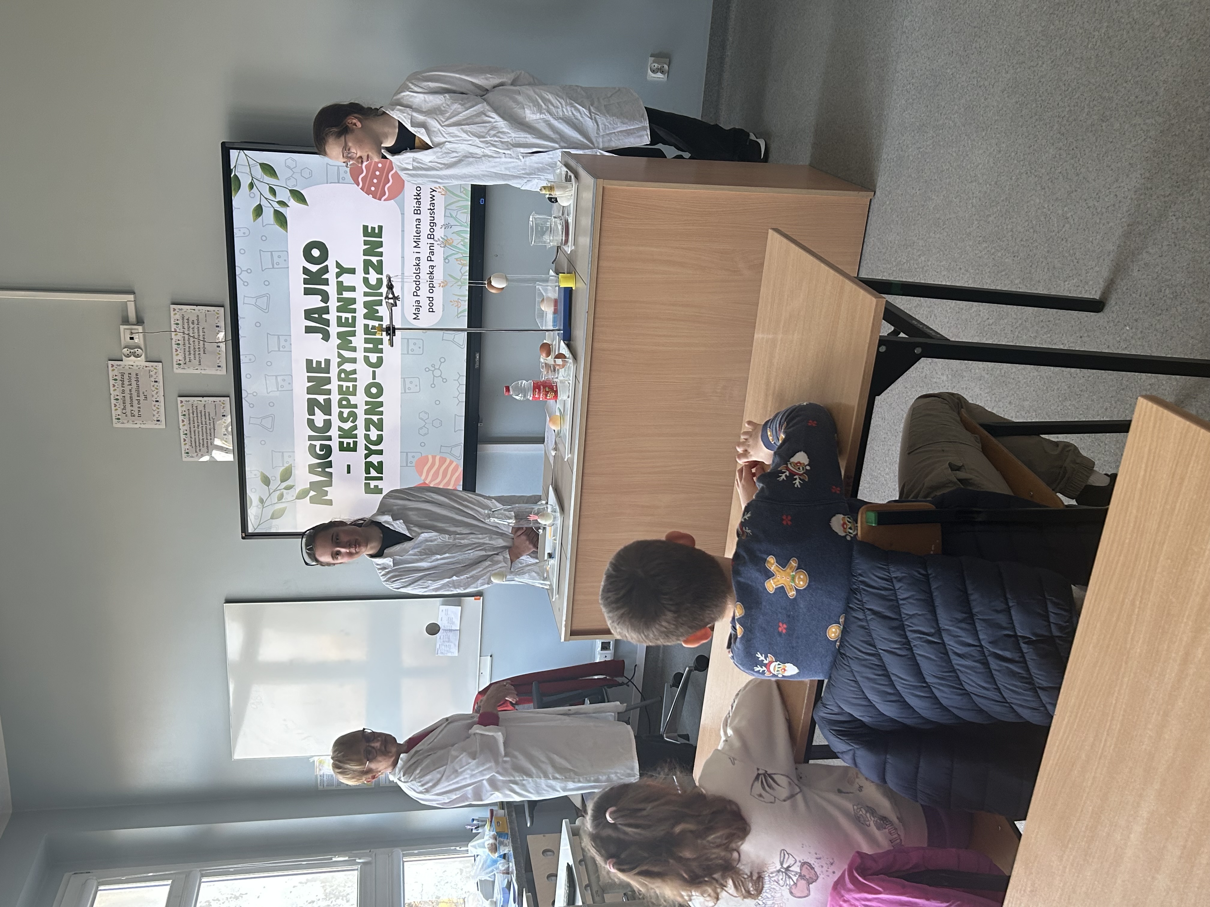 Zamiast tradycyjnego malowania pisanek postawiliśmy na naukowe widowisko. Nasi drugoklasiści z zainteresowaniem śledzili, jak jajka tracą skorupki, stając się sprężystymi piłeczkami i zmieniają kolor na srebrny. Zobaczyli, jak jajko samo wskakuje do butelki, zbadali wpływ magnesu na jajko-niespodziankę. Dzieci świetnie poradziły sobie z odróżnianiem jajka surowego od ugotowanego. Finał należał do widowiskowych mini-wulkanów oraz magicznego jajka rozświetlonego zimnym ogniem!