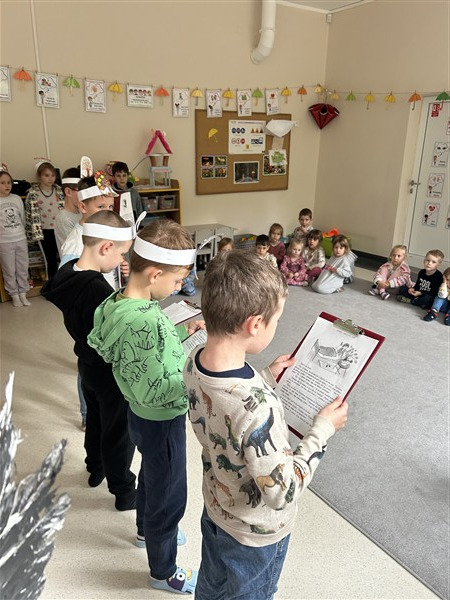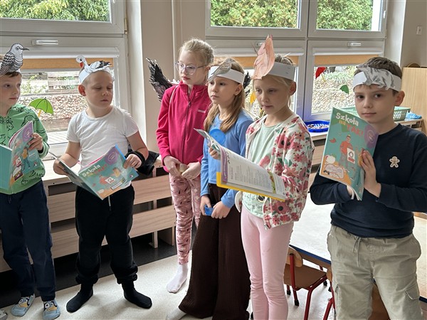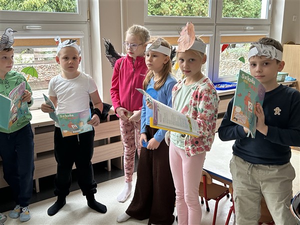 Z okazji Dnia Głośnego Czytania uczniowie klasy 2a odwiedzili przedszkolaki z grupy 1 w naszym przedszkolu. Zaprezentowali przedszkolakom opowiadanie pt. „Stary, zielony miś”, które przeczytali z pełnym zaangażowaniem, dbając o piękną interpretację tekstu. Następnie zaprezentowali inscenizację „Bal jesieni”, wprowadzając wszystkich w jesienny nastrój. Trzylatki z energią i zaangażowaniem zaprezentowały się w piosence „Jeż”.